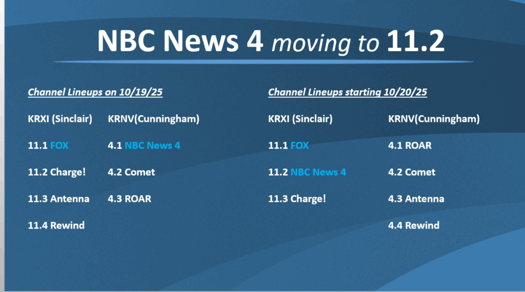 On October 20, 2025, NBC News 4 will be moving to 11.2, a change being implemented by the network. Please note that this change is not reflective of a decision by the Elko Television District. Click here for more information regarding the decision.